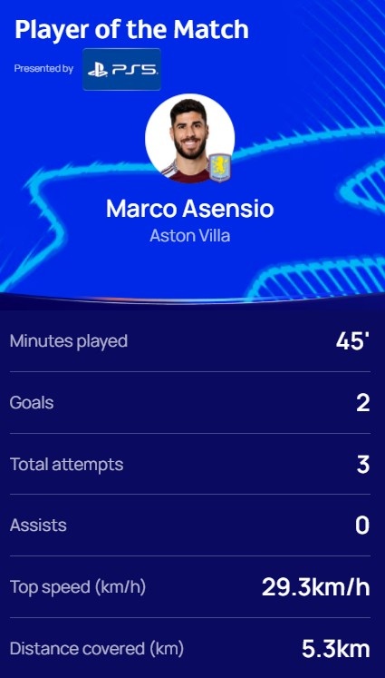 本場比賽替補(bǔ)登場的阿森西奧梅開二度,3次射門,跑動距離5.3km,賽后他也當(dāng)選歐冠官方評選出的本場最佳球員。